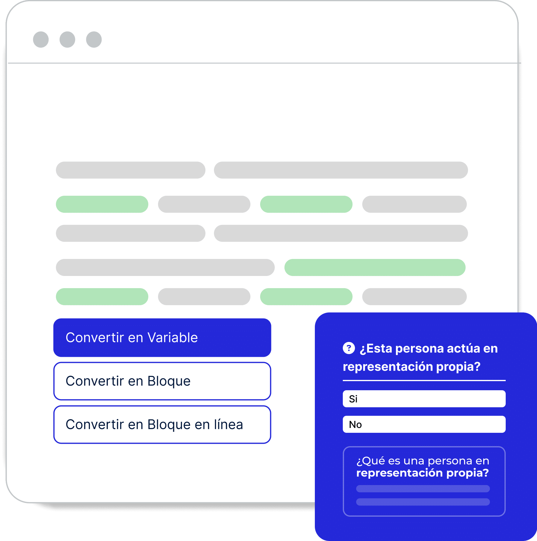 Automatiza la creación de acuerdos legales en todas las áreas de tu negocio, asegurando eficiencia, calidad y cumplimiento. Define variables, condiciones y crea formularios para generar documentos sin esfuerzo y sin errores.