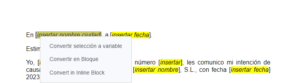También puedes hacerlo seleccionando el símbolo «{ }», en el lado derecho del Editor. Esta función te ayudará a identificar y configurar las variables dentro de tu documento que previamente identificaste con los dobles corchetes. El sistema detectará automáticamente estas variables, lo que hace que el proceso sea fluido y eficiente.